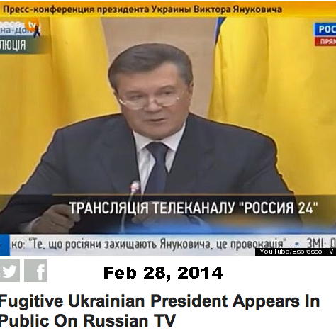 And then compare these mobsters to the faces of the disenfranchised Ukrainian people whose voting choice the West took away (above right). You can also see the mobsters who now rule the Ukrainian capital joyriding in an army vehicle through Kiev (above right). In a televised speech released today (Feb 28), the ousted President Yanukovich claimed he never issued order for the police to fire on demonstrators (right).