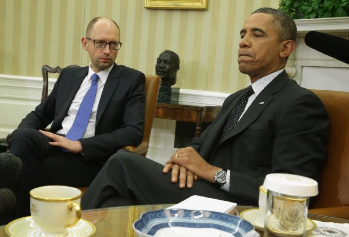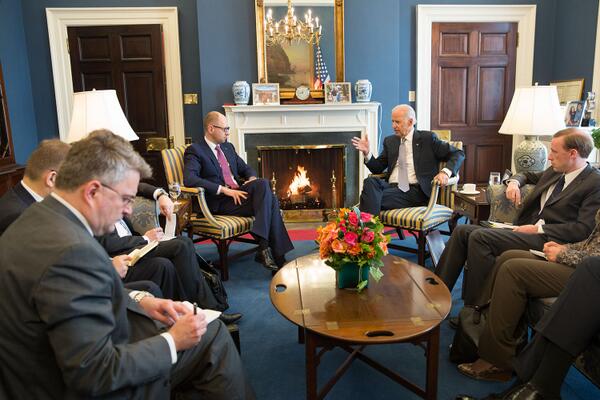 In fact, shortly after installing its puppet as the Ukrainian prime minister following the Feb 21 coup d’etat, Perfidious Washington paraded Arseniy Yatsenyuk in Brussels with Secretary-General Anders Fogh Rasmussen (Mar 6, right photo). And then they repeated the media show with him in Washington where Yatsenyuk met with Obama and Biden (Mar 12, 13).