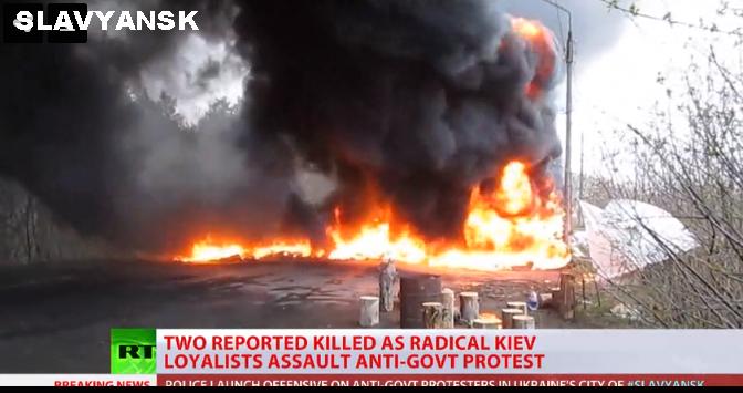 Ukraine as the government troops cracked down on protesters in Slavyansk. Two people have been reportedly killed so far, according to this RT.com report. One Ukrainian lawmaker told the Moscow Times that Ukrainian Security Service (SBU) had become a unit of the CIA.