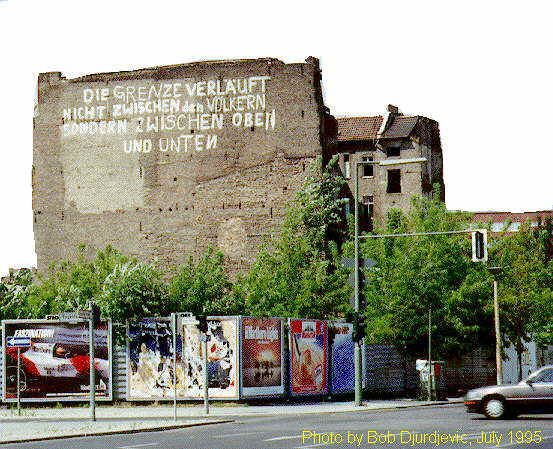 A crude hand-painted sign on a run-down building in East Berlin, not far from the former “Checkpoint Charlie” crossing which once divided the West and the East, read as follows (July 1995 photo):“The border runs not between the peoples, but between top and bottom.” The implication? The Berlin Wall may be down, but class differences remain.