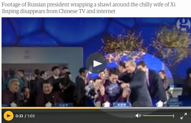 Making things worse for the Beijing authorities, the Russian president is a heart-throb among many Chinese women for his macho, man-of-action image. But being more attentive to the Chinese President’s wife in public than her husband was too much for them. So the censors scrubbed the video from the Chinese internet showing Putin’s shawl gesture.