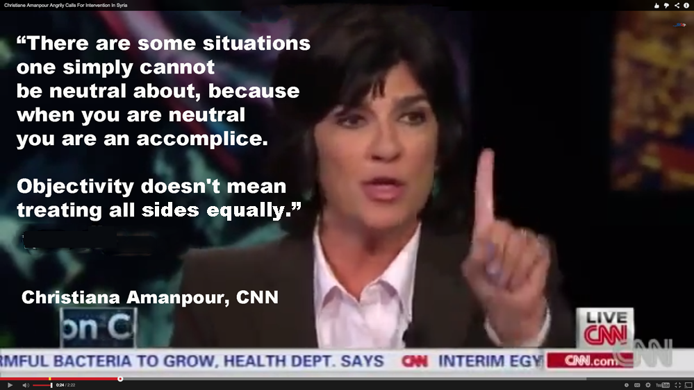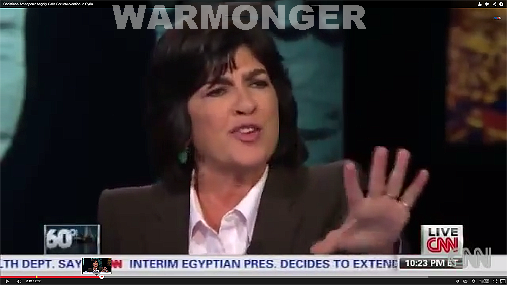 After Bosnia, Amanpour continued that kind of propaganda work for the State Department under the guise of a CNN reporter in other world conflict zones – Iraq, Afghanistan, Sudan, and Syria, among others.