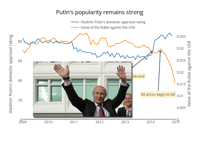 Meanwhile, Putin’s popularity in Russia is soaring despite the drop in the ruble and oil prices, while Obama’s approval ratings are hitting rock bottom (see the charts).
