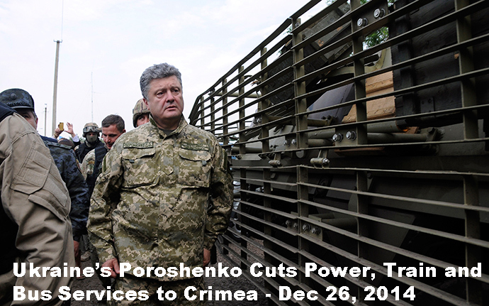 Washington puppet, ordered that power, train and bus services to Crimea be cut off (see Wall Street Journal, Dec 26, 2014). Crimea voted back in March to secede from Ukraine and rejoin Russia (see PUTIN LASHES OUT AT WASHINGTON’S TREACHERY, WELCOMES CRIMEA BACK INTO RUSSIA’S FOLD, MARCH 19, 2014).