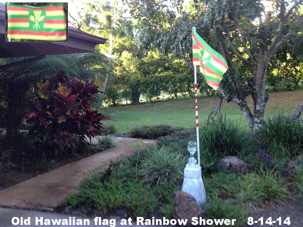 Here at the Rainbow Shower, we are flying the Hawaiian flag upside-down today. Whenever we are in residence, we also fly the sovereign Kingdom of Hawaii flag in from of the Rainbow Shower (right and below).