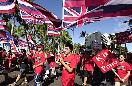 (demonstrators for Hawaiian sovereignty carrying upside-down state flags)