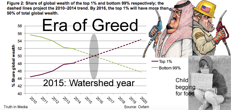 The top 1% have about as much wealth as the bottom half. By 2016, they will have more than 50% of the global wealth, Oxfam predicts using the current trends.