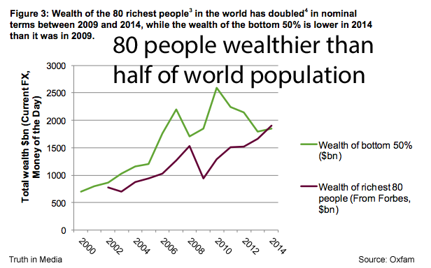 Another indicator of how much of a Wall Street lapdog Obama has been is that the wealth of the 80 richest people in the world has doubled in between 2009 and 2014, while the wealth of the bottom 50% was lower in 2014 than it was in 2009.