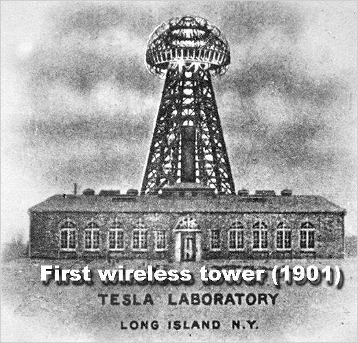 In 1901, Tesla proposed using large-scale coils to transmit electricity through the troposphere to power homes. He started building in Wardenclyffe Tower on Long Island in 1901, the very first telecommunications tower that would also test his idea for wireless power transmission (above right).
