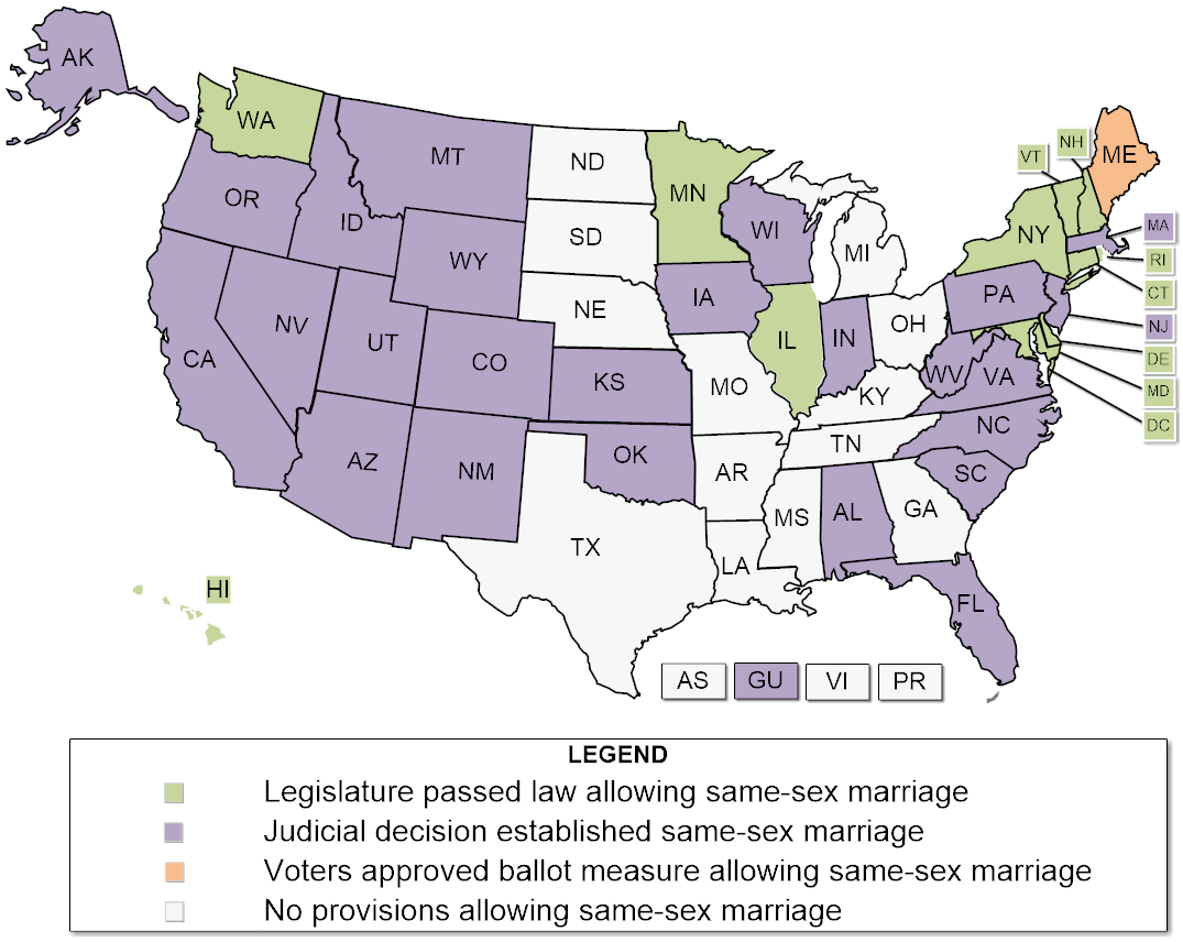 How fast? As recently as Nov 1998, Hawaii and Alaska become the first U.S. states to pass constitutional amendments against same-sex marriage. By 2012, 31 states had passed constitutional amendments against same-sex marriage.