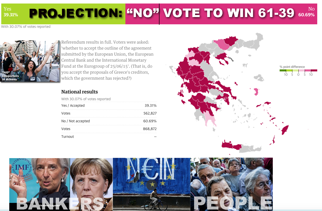 The other possibility is that the bankers blink and give in. Which is what the Greek government has been hoping. Now armed with support of the whole country, their hand at the negotiating table has been strengthened immensely.