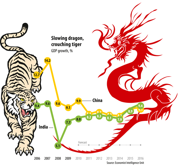Furthermore, China’s growth has slowed considerably in the last few years (right), while India’s is coming on strong (left).