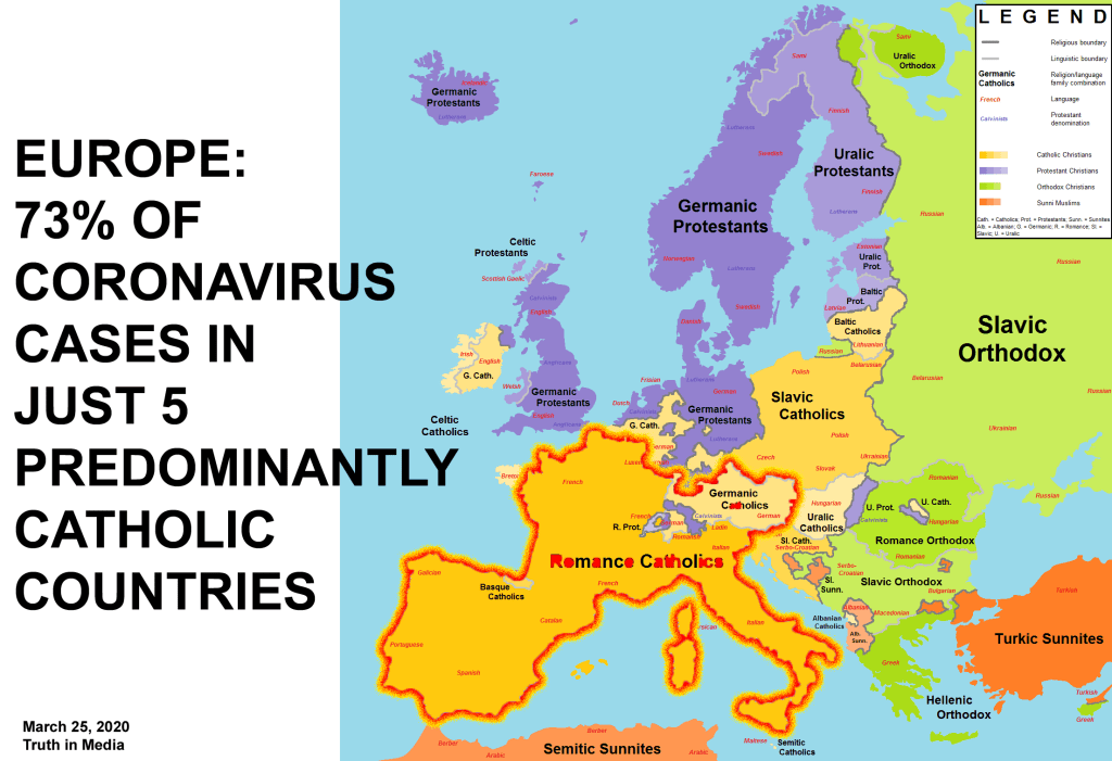 74% of all U.S. coronavirus cases are in just 8 predominantly Catholic states; 73% of all European cases are in just 5 predominantly Catholic countries