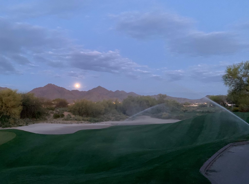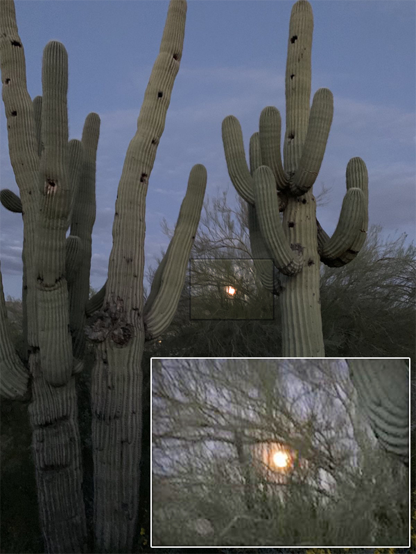 About half way through, a trickle of yellow light appeared from behind the McDowell Mountains. It grew quickly into a magnificent yellow moon. The moon had an orange corona around it.