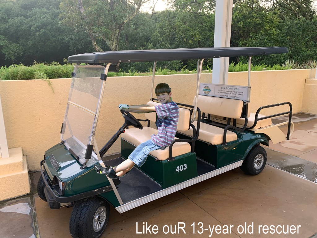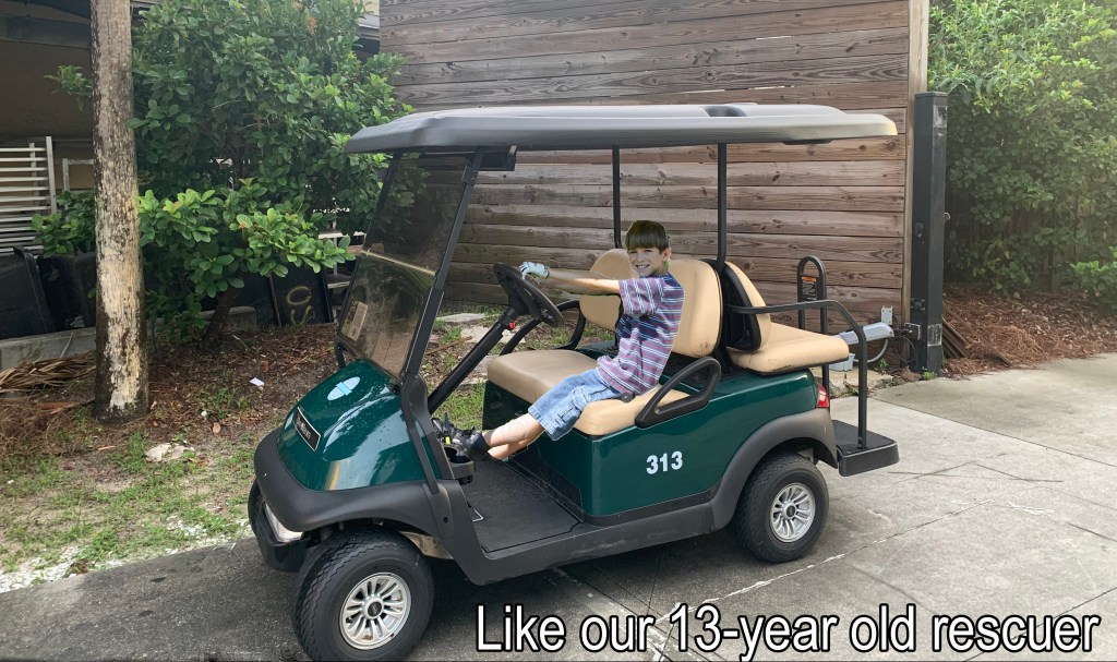 “Do you want a ride?” a boy repeated sitting behind the wheel of a golf cart. He looked like a young teen. Or maybe even younger.