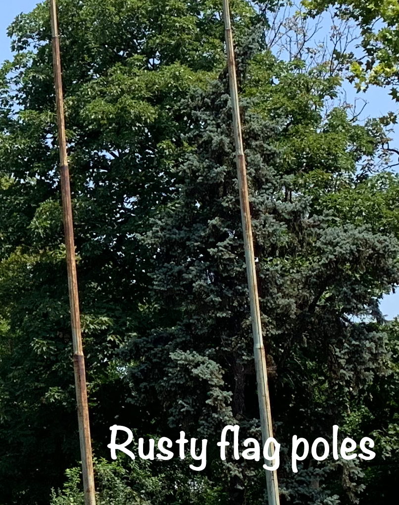If you zoom in on the details around the building, which we see almost every day when we walk by it, you see decaying sidewalks, torn up tiles, weeds where grass is supposed to be, foot-trodden paths through the lawns, dog poo and even rusty flagpoles without any flags.