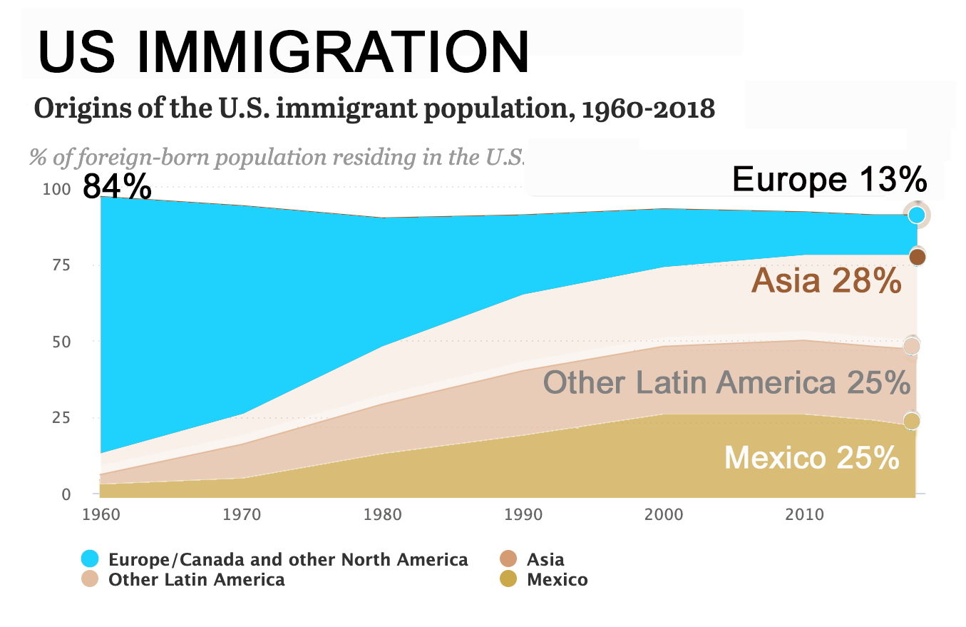 The regions of origin for immigrant populations residing in the U.S. have dramatically shifted since the passage of the 1965 Immigration and Naturalization Act. In 1960, 84% of immigrants living in the U.S. were born in Europe, Canada or other North American countries, while only 6% were from Mexico, 4% from Asia, 3% from the rest of Latin America and 3% from other areas. Immigrant origins now differ drastically, with European, Canadian and other North American immigrants making up only a small share of the foreign-born population (13%) in 2018. Asians (28%), Mexicans (25%) and other Latin Americans (25%) each make up about a quarter of the U.S. immigrant population, followed by 9% who were born in another region.