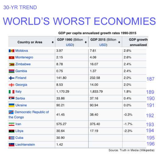 The fact that Iran (#193) and Cuba (#195) are also on this list of the worst economic performers seems to confirm this theory. But it is a puzzle while Finland (#187) and Lichtenstein (#196) are on it.
