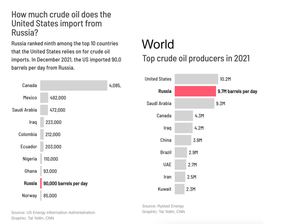 Not only is the amount of oil the US imports from Russia negligible relative to other American imports (only about 3% vs. Europe 60% and China 20% – see the charts), but it takes time for the imported oil to reach the pumps. The fact that the US retail gas prices skyrocketed instantly after Biden announced his Russia sanctions is proof that the domestic oil companies and their retail gas station operators seized the chance to fleece the American consumer right away.