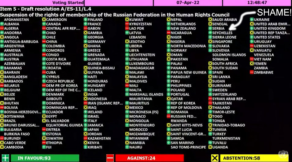 On Thursday, the UN General Assembly voted to suspend Russia from the organization’s human rights panel. Serbia was among the 93 member states that backed the suspension. That’s barely more than 50% of the UN membership. Twenty four countries voted against (China, Iran, Bolivia, Syria… among them). Fifty eight countries abstained (India, Saudi Arabia, Singapore, Egypt, Malaysia, Jordan, UAE… among them).