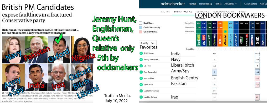 As things stand right now, the odds-on favorite is of Indian extraction. In fact, four of eight leading candidates are non-whites, two come from military/spying backgrounds, and one is a liberal bitch. Which leaves only one Englishman and a gentleman in the backstage brawl, and a relative of the Queen, at that – Jeremy Hunt.
