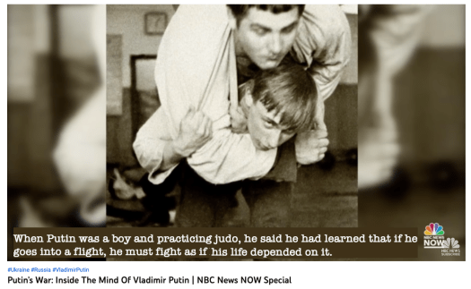 Like Teddy Roosevelt, Putin practices judo. But unlike Roosevelt, he is a black belt in this ancient Japanese martial arts discipline. As a child, while training judo, Putin said he had learned that if he goes into a fight, he must fight as if his life depended on it,