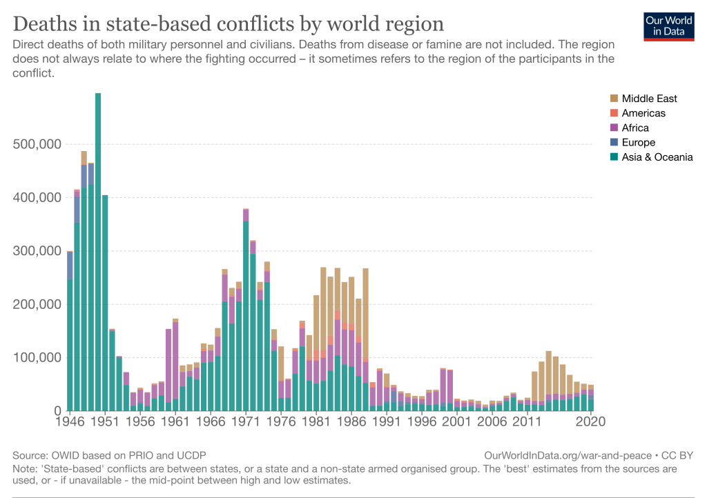 Which is a sad indictment of mankind. We have actually regressed since the deadliest war in human history which was supposed to teach us to curtail our animalistic impulses. In WW II, an estimated 70-85 million people died. Since 1945, more than double that number have perished in various wars around the globe (see the chart below).