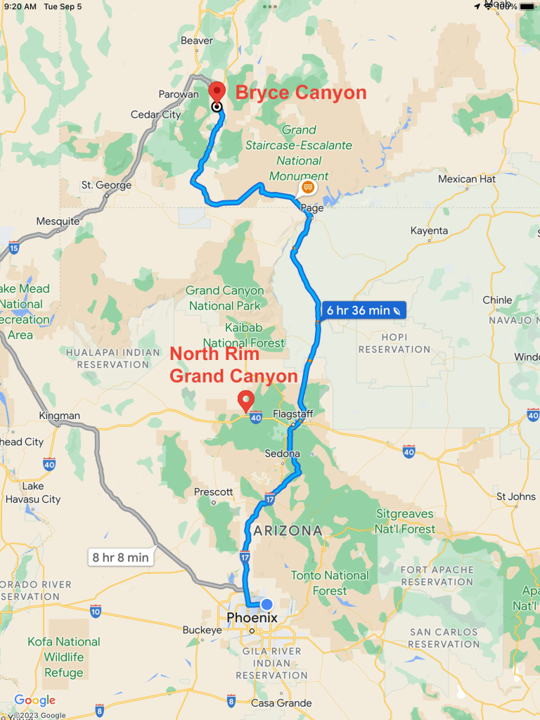 Fast-forwarding to Labor Day weekend 2023. We decided to spend this holiday, which marks the end of summer in America, at the Grand Canyon. But not at the usual spot where all tourists go – the South Rim – which is much more easily accessible from Phoenix (a 3.5hr-drive). We did that in 2019 and again in 2021.