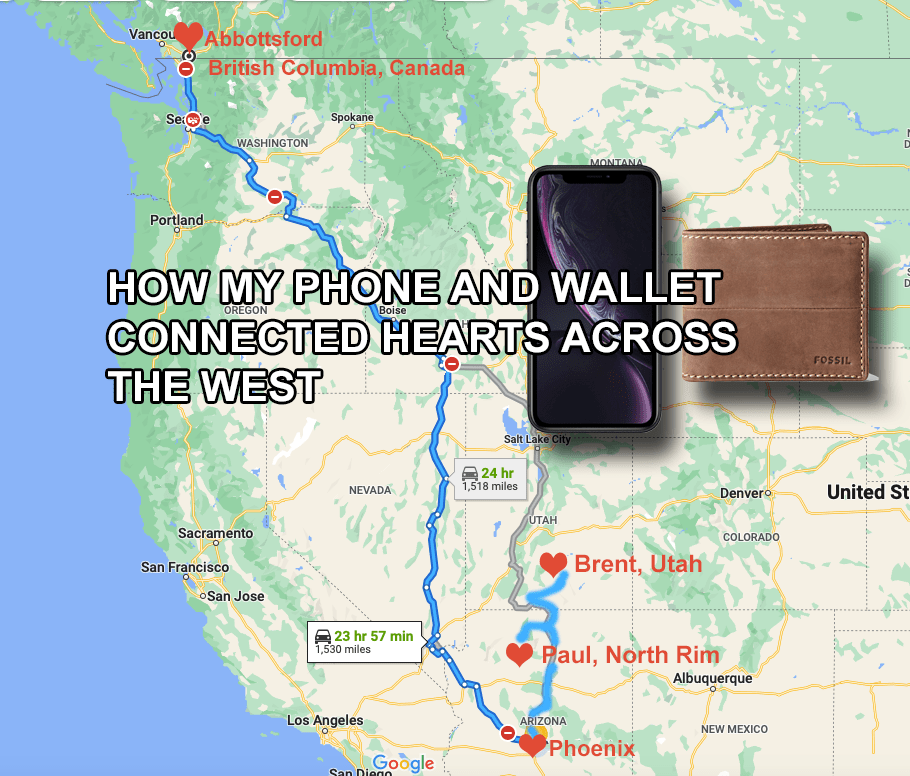 “They said they had pulled over and when a white car passed them, your phone landed practically in the lap of one of them. But because they are from Canada and don’t have a US cell phone number, they couldn’t call anyone until they got here in Utah. They are my regular hotel guests.”