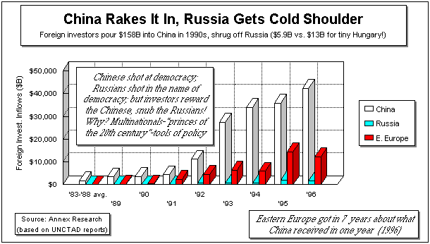 Of course, they could not have done it without the help from the corrupt Boris Yeltsin regime. Zhirinovsky cited one example (in Grusia, as I recall), where some Russians and their foreign investment partners were able to buy an entire factory for about $200,000.