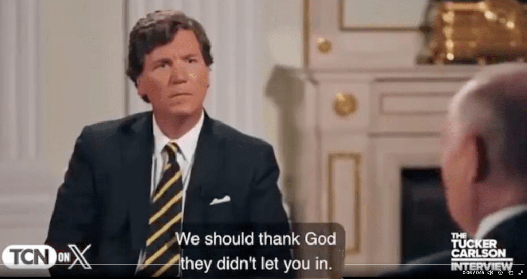 Addressing Carlson, Putin said, (that’s) “the organization you wanted to join back in the day, as I understand. Maybe we should thank God they didn’t let you in. Although, it is a serious organization. I understand.”