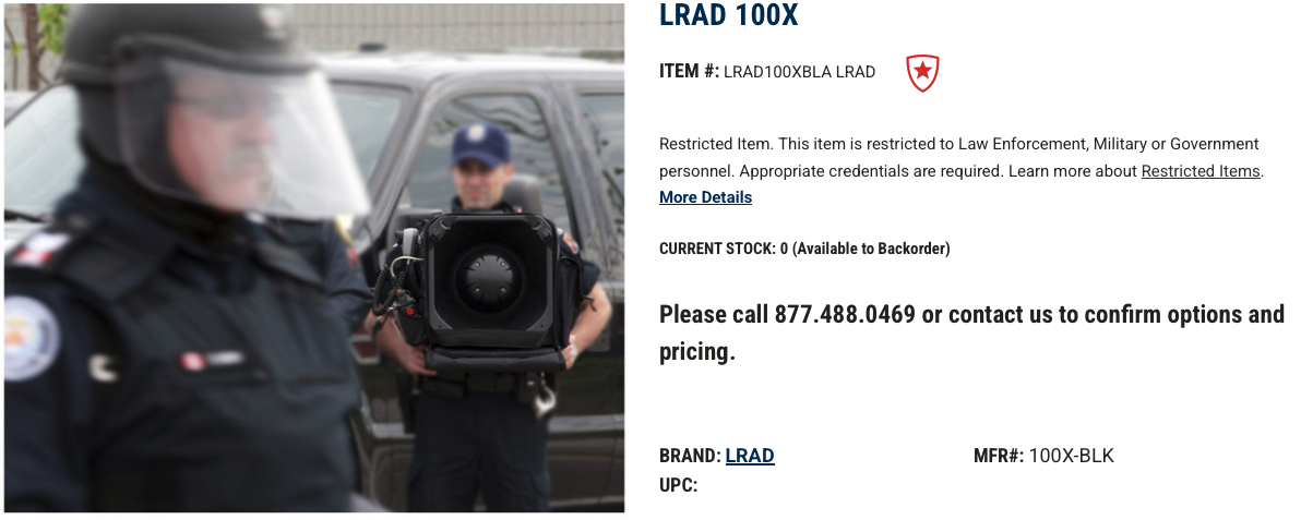 It is also because it is ILLEGAL in the US to sell it to individuals. “This item is restricted to Law Enforcement, Military or Government personnel,” reads the Curtis Blue Line website which sells LRADs (see above image).