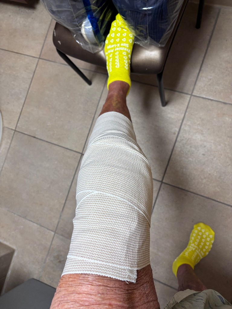 Then she had to remove the heavy bandages from my knee and replace them with a long waterproof sticky bandage.