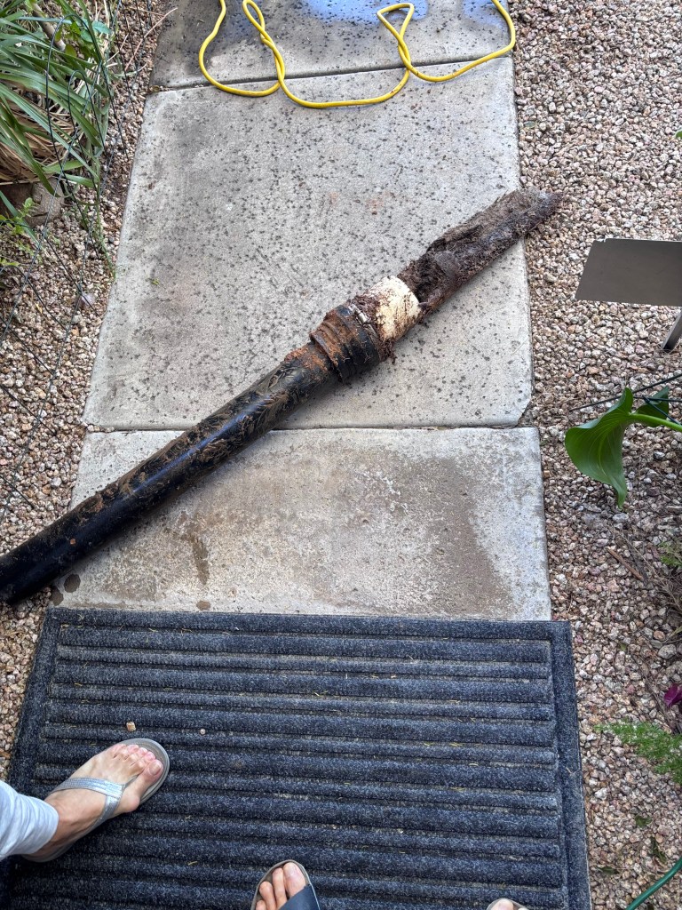 The next morning, a couple of different young men from Roto Rooter arrived with their heavy equipment. They spent about 4 hours excavating and reconnecting the lines. The diagonis was confirmed. Here’s the culprit: