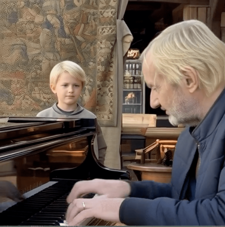 An older pianist… ghostly figures of Mozart, Beethoven, the Beatles… a young boy listening in silence and awe.