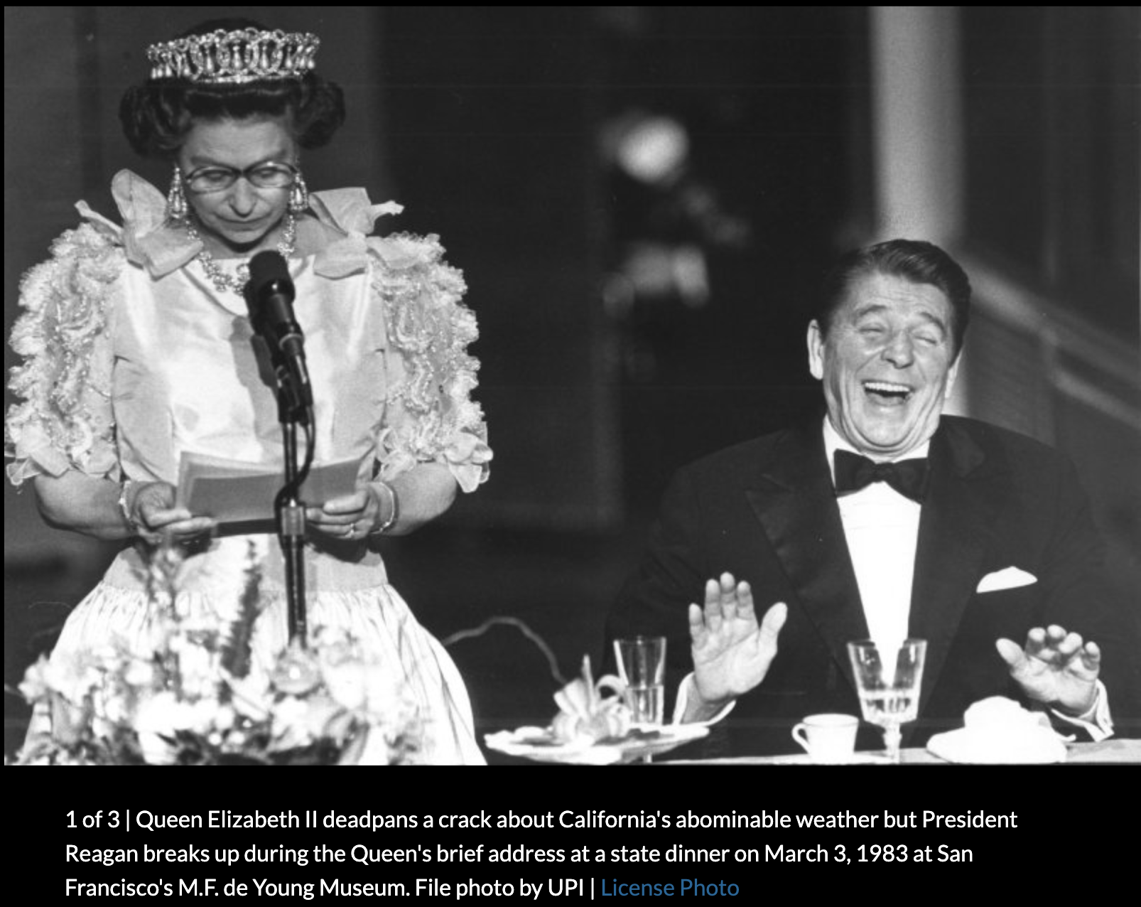 Instead of sailing triumphantly under the Golden Gate Bridge, the Queen was forced to fly from Santa Barbara on Air Force One with the Reagans — leaving the British sailors to ride out the storm at sea.